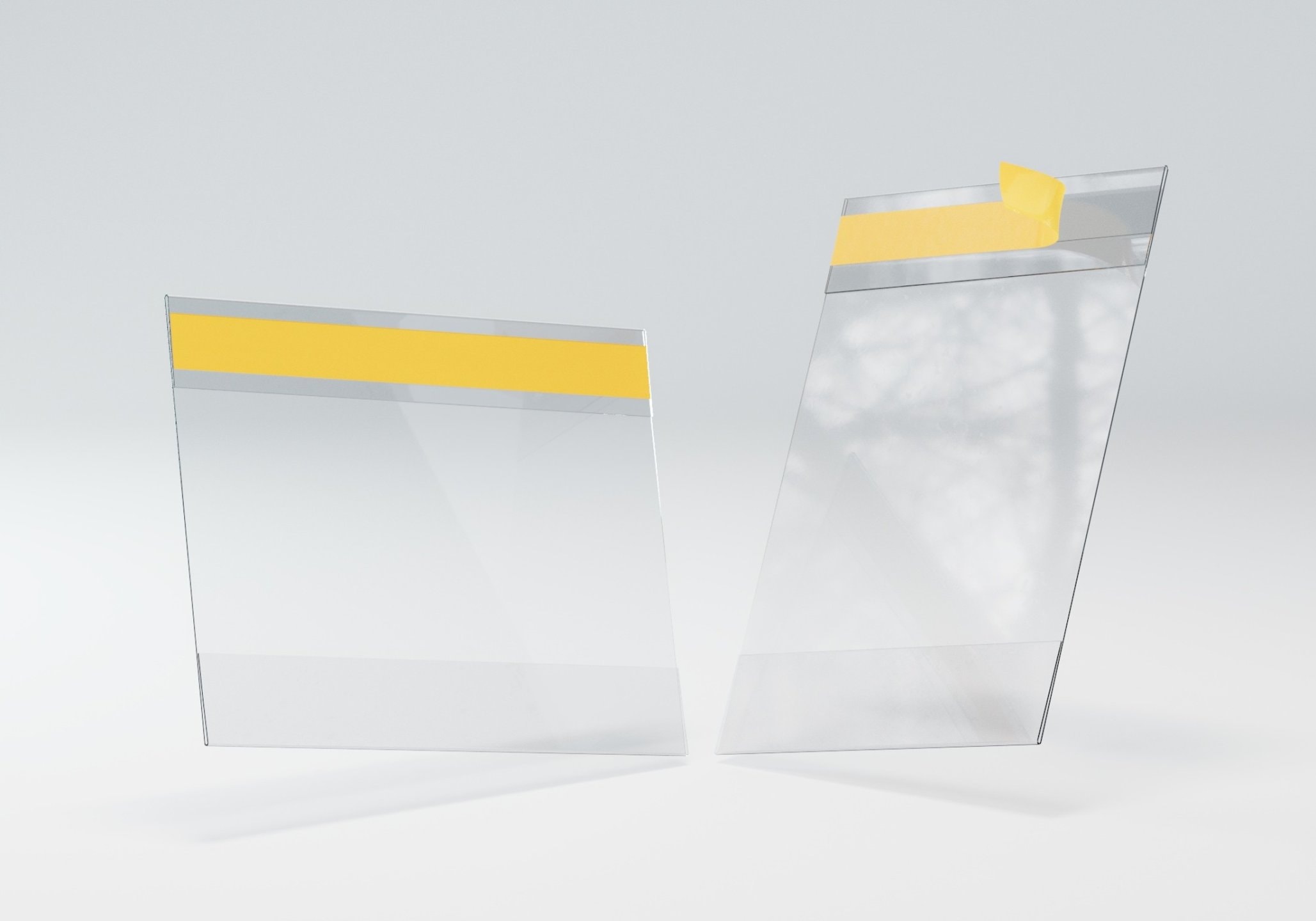 Samolepicí plastová kapsa se dvěma ohyby z tenkého tvrdého plastu. Kapsa je určena pro vložení štítku, letáku, cenovky nebo popisky. Kapsy vyrábíme z tvrdé PVC nebo PET fólie od německého výrobce Klöckner Pentaplast s lesklým nebo matným (antireflexním) povrchem. Použitá tloušťka materiálu 0,4 - 0,7 mm, dle velikosti. Matný povrch je odolnější proti poškrábání. Kapsy jsou opatřeny transparentní, oboustranně lepicí páskou FG150 s pevným PP nosičem a kaučukovým lepidlem. Páska je vhodná k aplikaci na většinu hladkých povrchů, plastů, skla, lamino desek a lakovaných materiálů, papíru a kartonu. Na přání Vám kapsy vyrobíme v individuálním provedení, z jiného materiálu nebo s libovolným typem lepicí pásky. Kapsa má standardně jeden samolepicí pásek, pokud požadujete dva samolepicí pásky, napište požadavek do poznámky v objednávce nebo do e-mailu. Nakupujete u výrobce